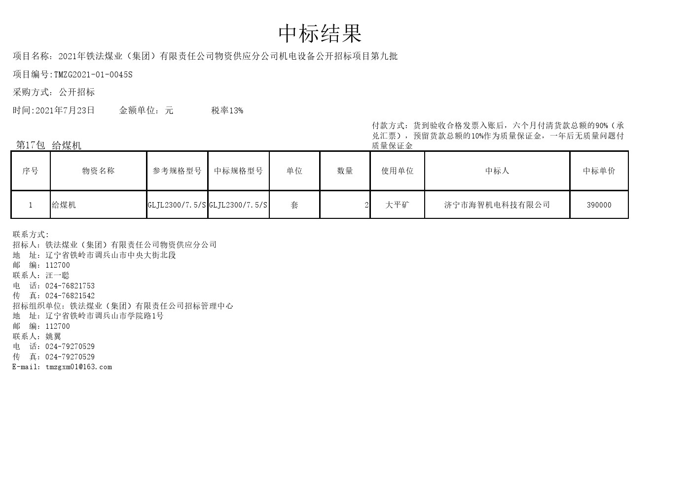 2021年7月23日设备中标结果公告2