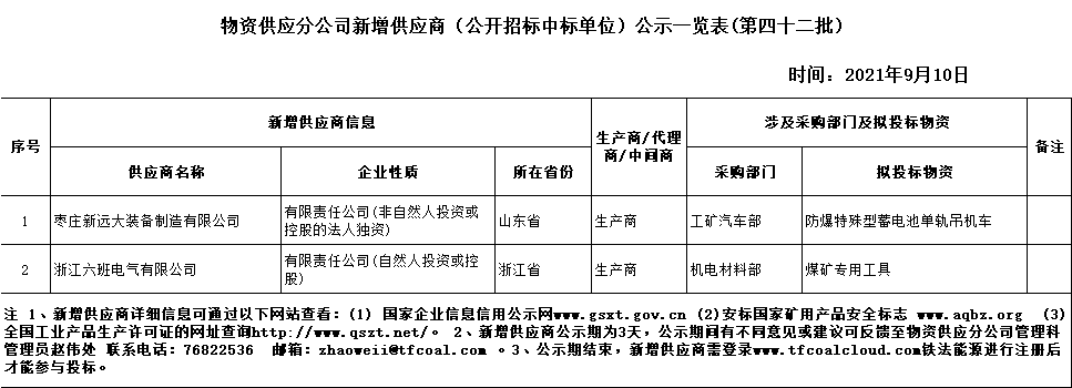 物资供应分公司新增供应商(公开招标中标单位)公示一览表(第四十二批)