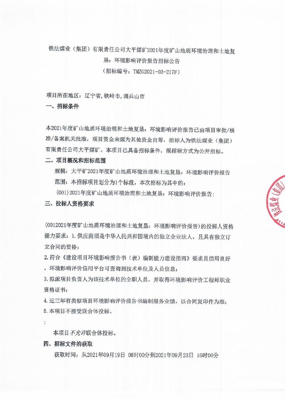 铁法煤业(集团)有限责任公司大平煤矿2021年度矿山地质环境治理和土地复垦:环境影响评价报告招标公告