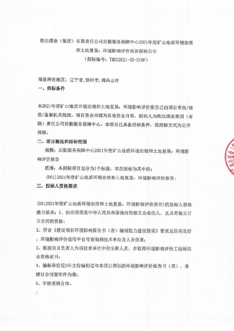 铁法煤业(集团)有限责任公司后勤服务保障中心2021年度矿山地质环境治理和土地复垦:环境影响评价报告招标公告