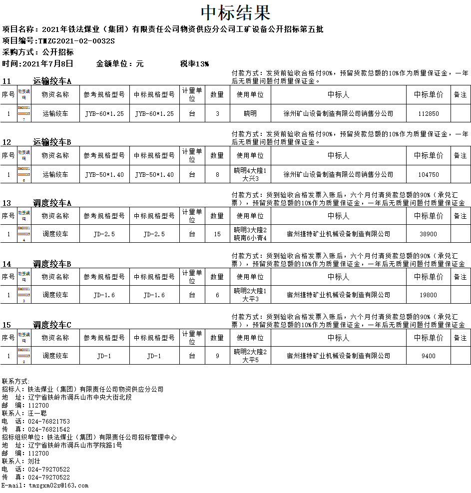 2021年7月8日工矿设备中标结果公告(第11-15包)