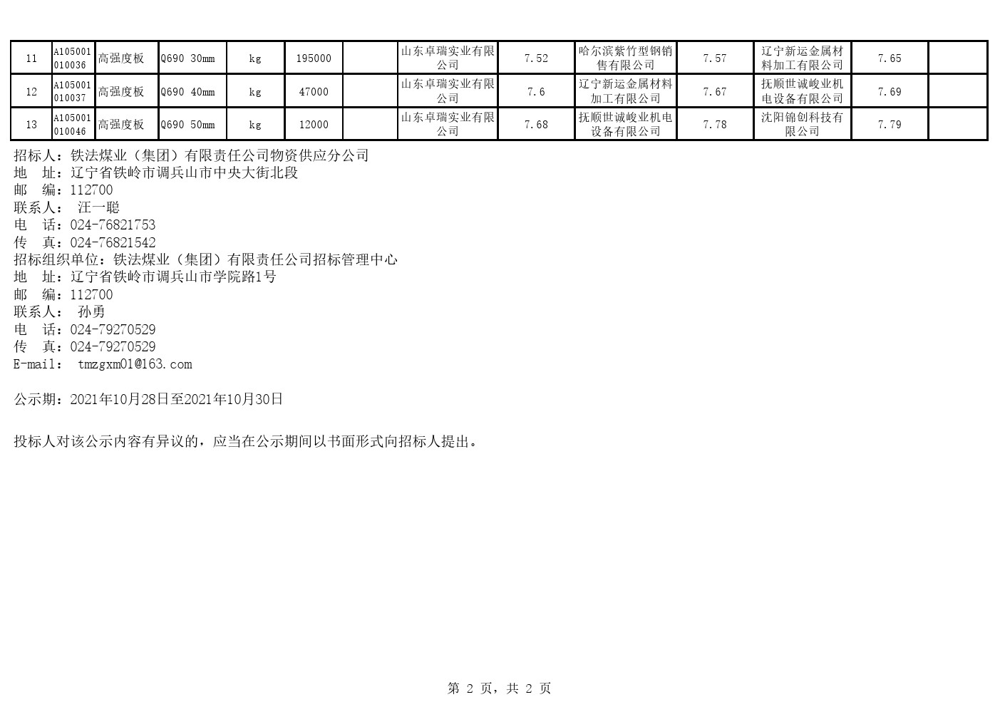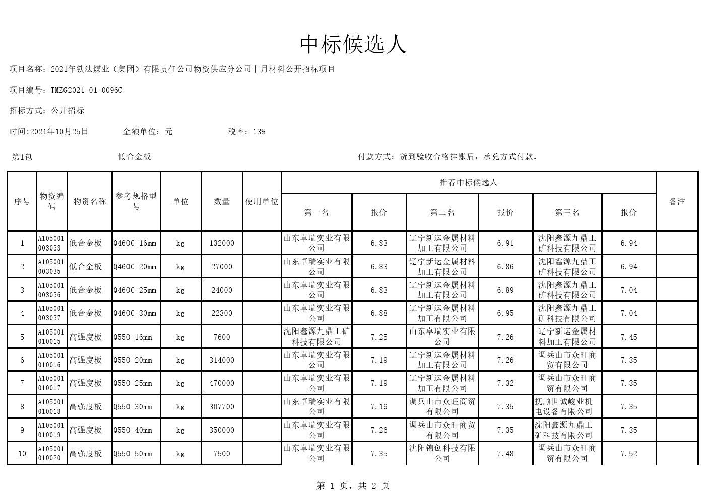 2021年10月25日材料中标候选人公示