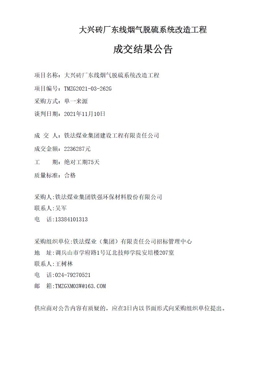 铁强环保 大兴砖厂东线烟气脱硫系统改造工程成交结果公告