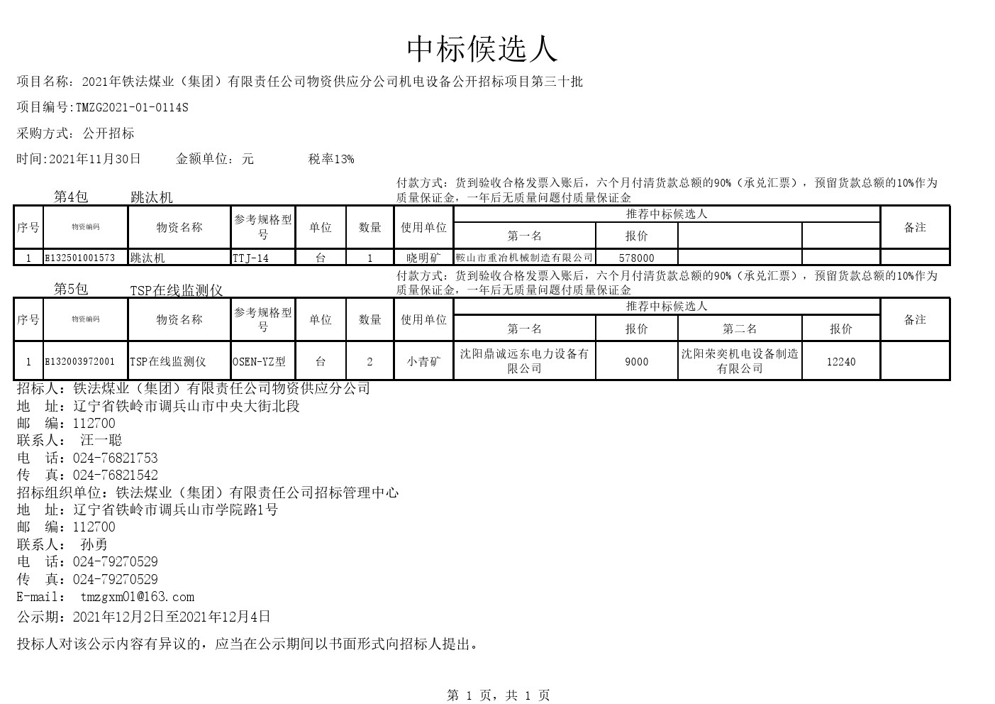 2021年11月30日机电设备中标候选人公示