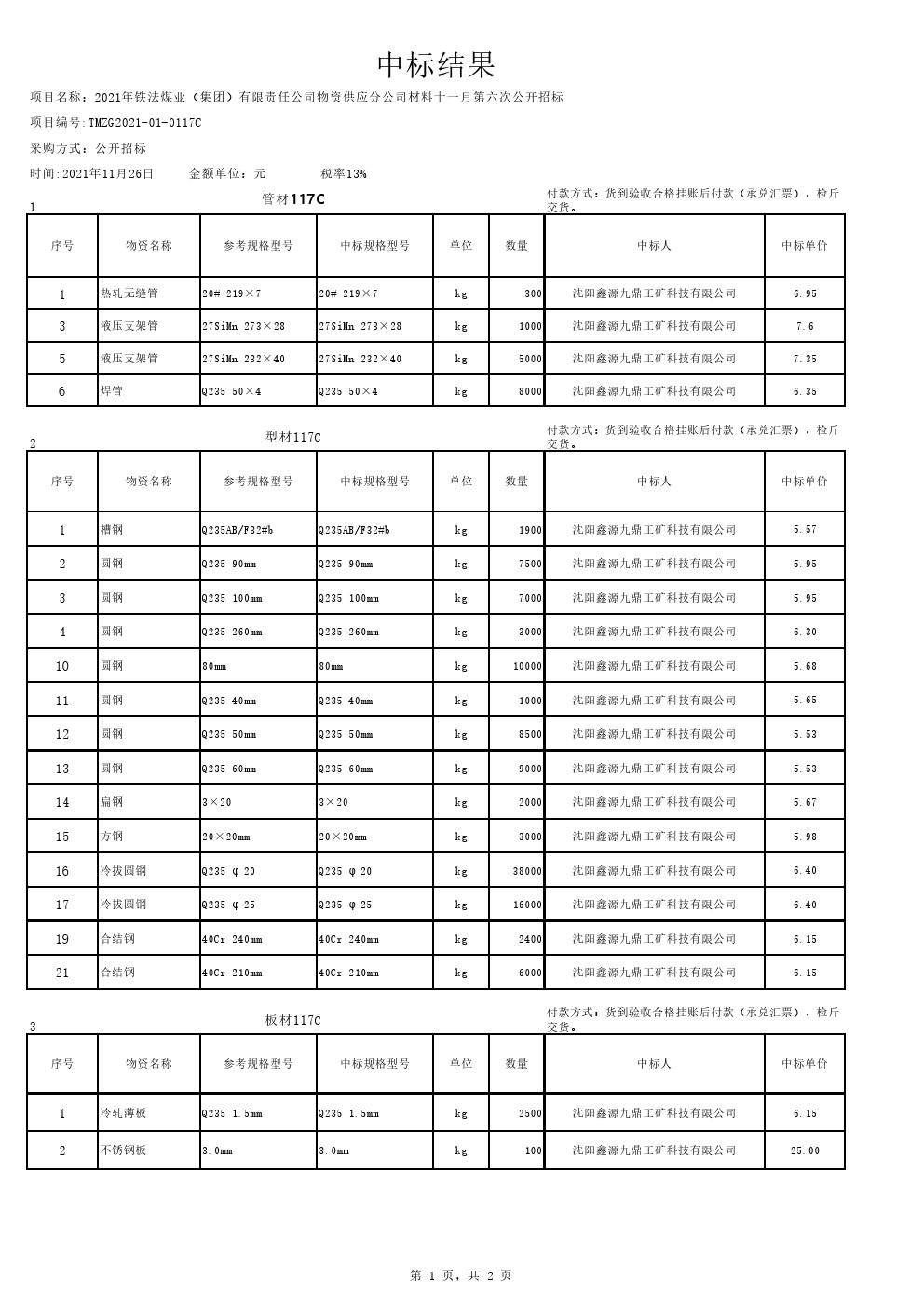 2021年11月26日材料十一月第六次公开招标中标结果公告