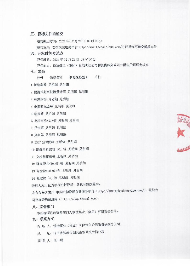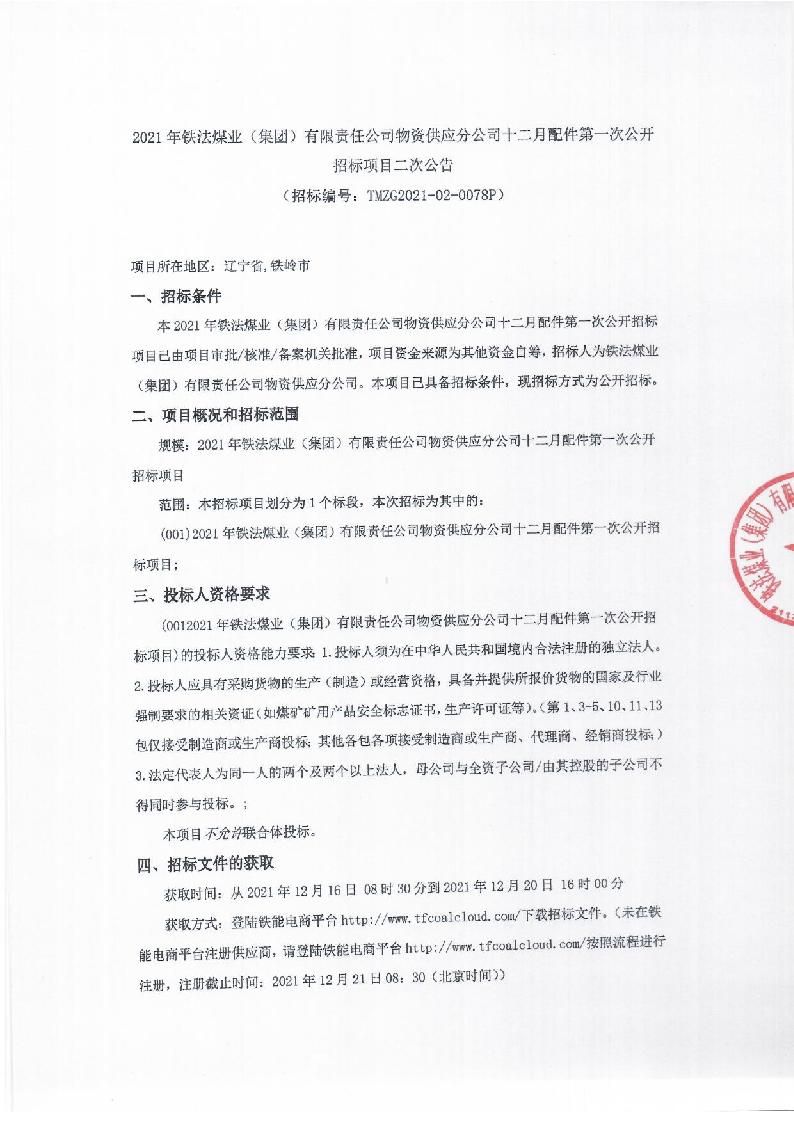2021年12月23日配件公开招标项目二次公告