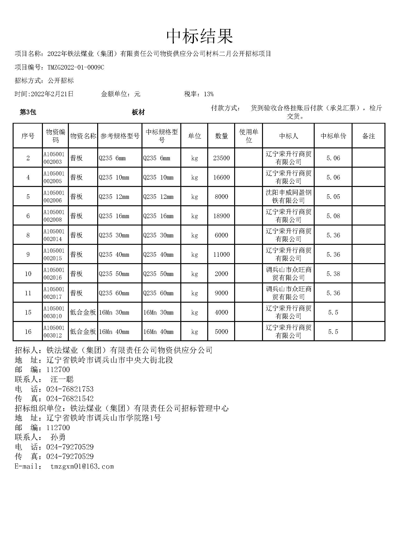 2022年2月21日材料中标结果公告(0009C) - 2