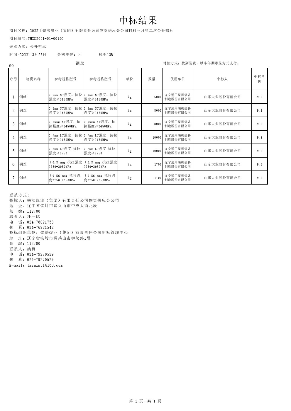 2022年3月28日材料公开招标中标结果公告1