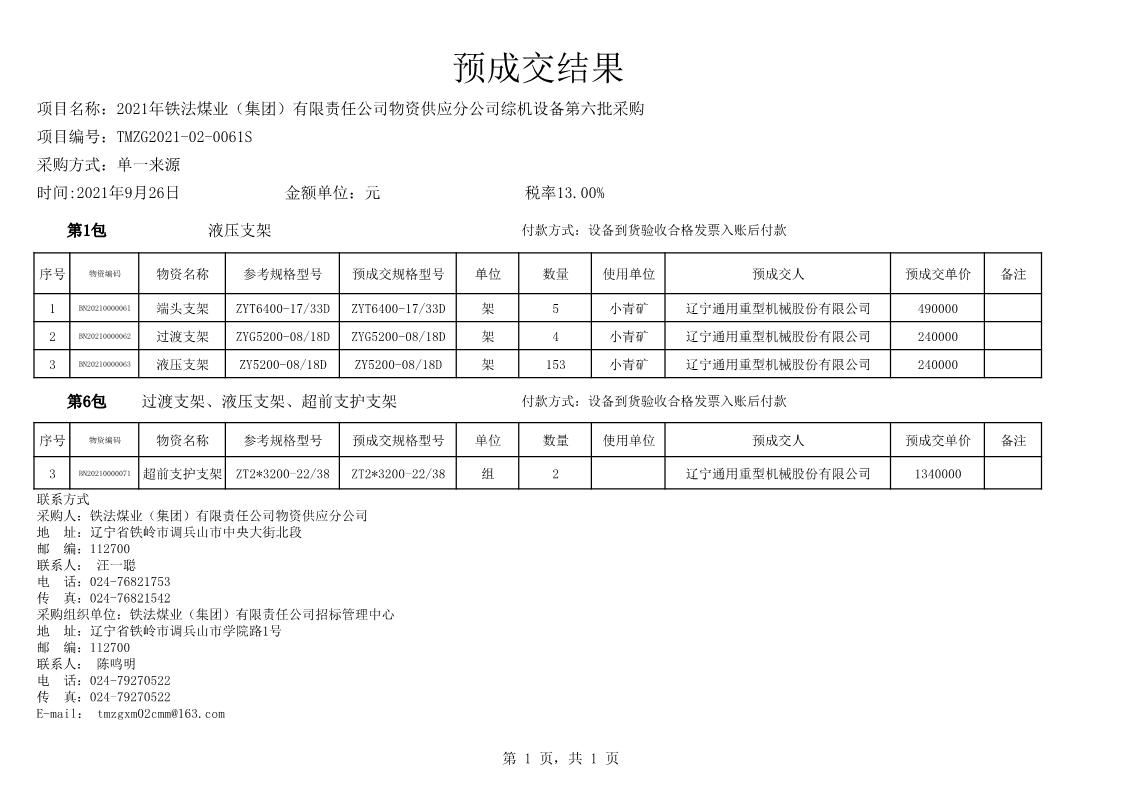2021年9月26日综机设备预成交结果公告
