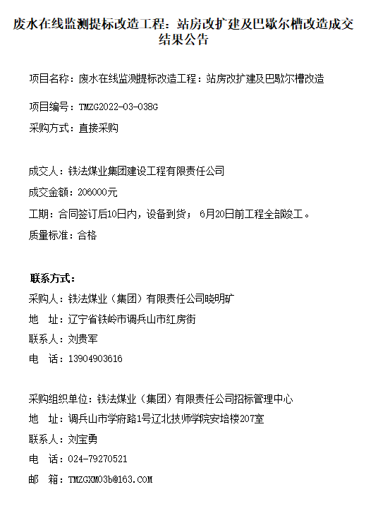 晓明矿废水在线监测提标改造工程:站房改扩建及巴歇尔槽改造成交结果公告