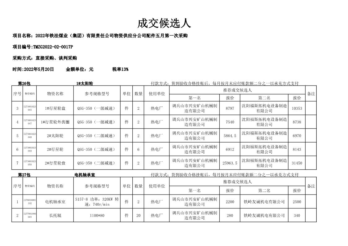 2022年5月20日配件成交候选人公示