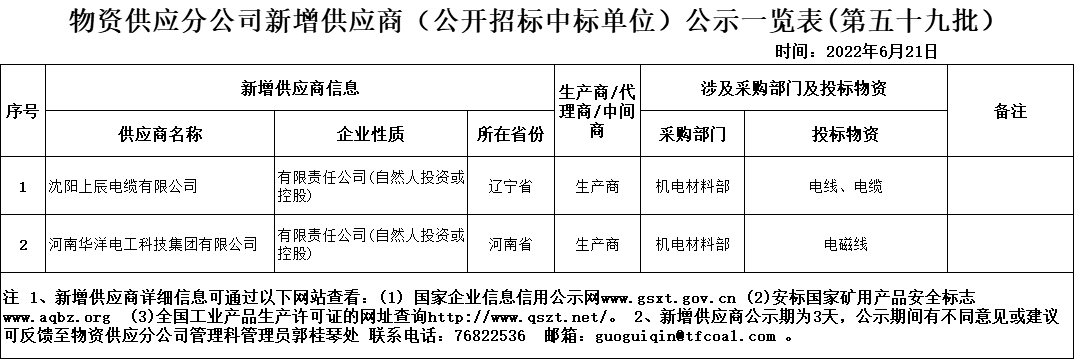 物资供应分公司新增供应商(公开招标中标单位)公示一览表(第五十九批)