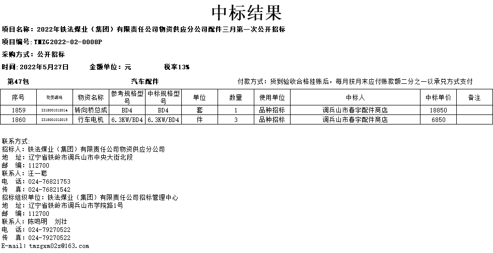 2022年5月27日配件公开招标项目中标结果第47包