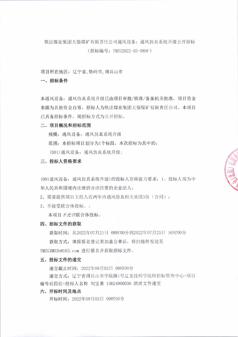 铁法煤业集团大强煤矿有限责任公司通风设备:通风仿真系统升级公开招标