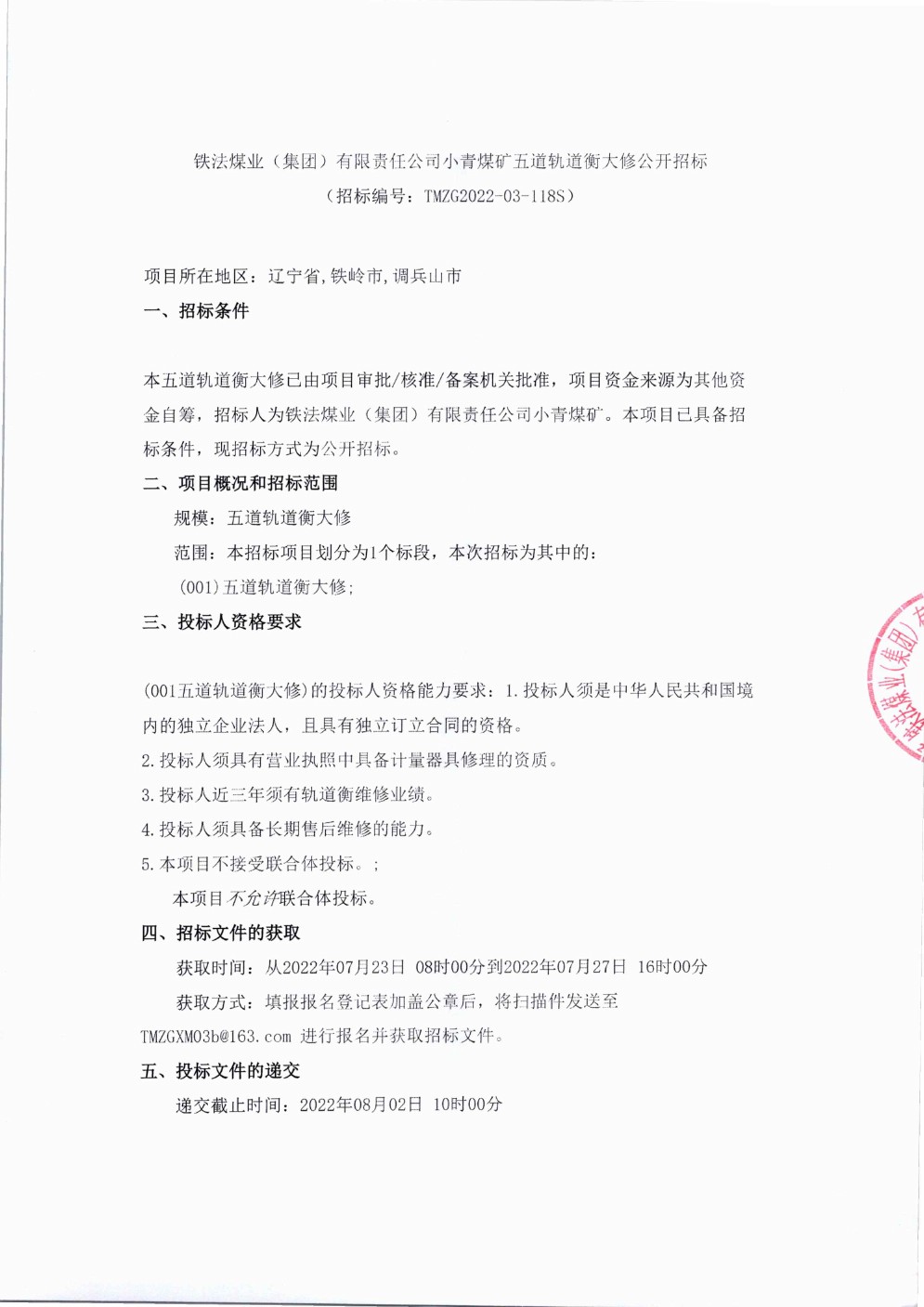 铁法煤业(集团)有限责任公司小青煤矿五道轨道衡大修公开招标
