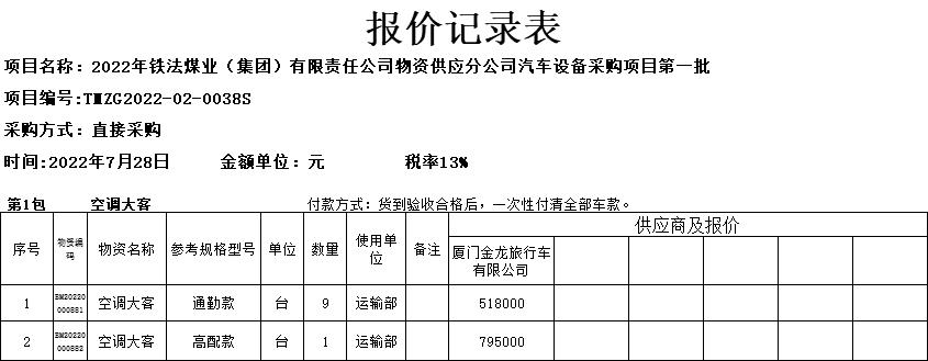 2022年7月28日汽车设备报价记录表