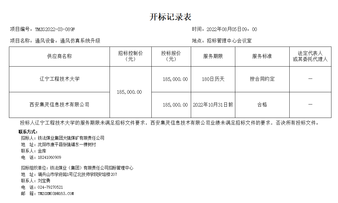 铁法煤业集团大强煤矿有限责任公司通风设备:通风仿真系统升级公开招标开标情况及否决原因
