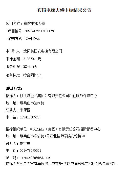 铁法煤业(集团)有限责任公司后勤服务保障中心宾馆电梯大修中标结果公告