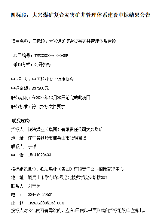 大兴煤矿复合灾害矿井管理体系建设中标结果公告