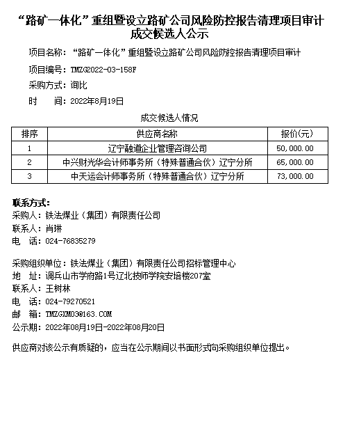 财务部“路矿一体化”重组暨设立路矿公司风险防控报告清理成交候选人公示