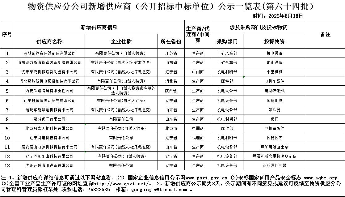 物资供应分公司新增供应商(公开招标中标单位)公示一览表(第六十四批)