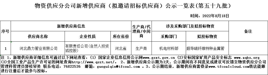 物资供应分公司新增供应商(拟邀请招标供应商)公示一览表(第五十九批)