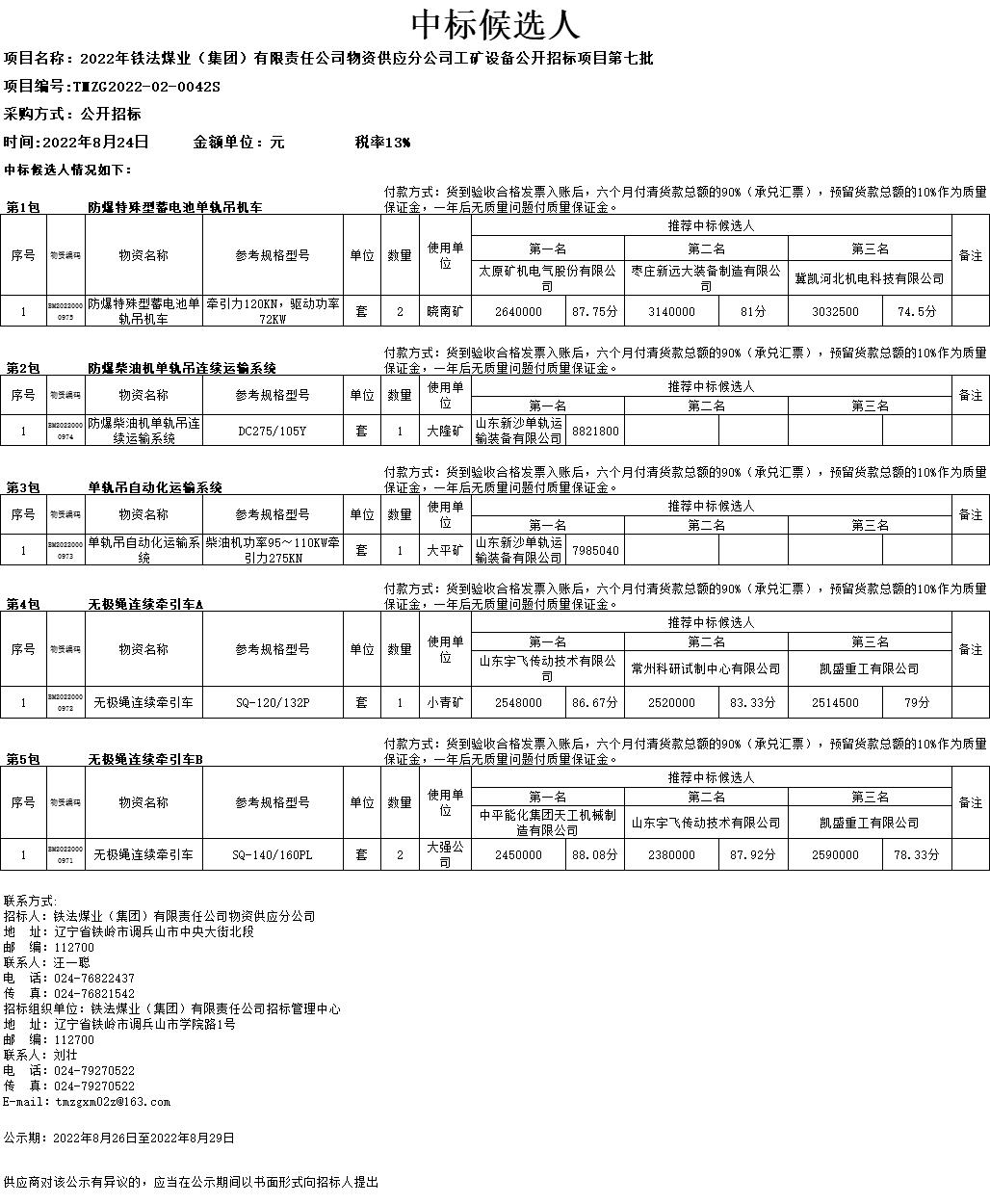 2022年8月24日工矿设备中标候选人公示