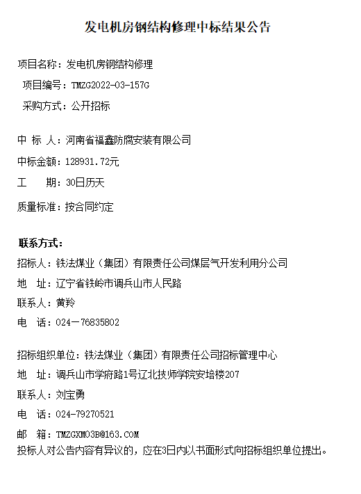 铁法煤业(集团)有限责任公司煤层气开发利用分公司发电机房钢结构修理中标结果公告