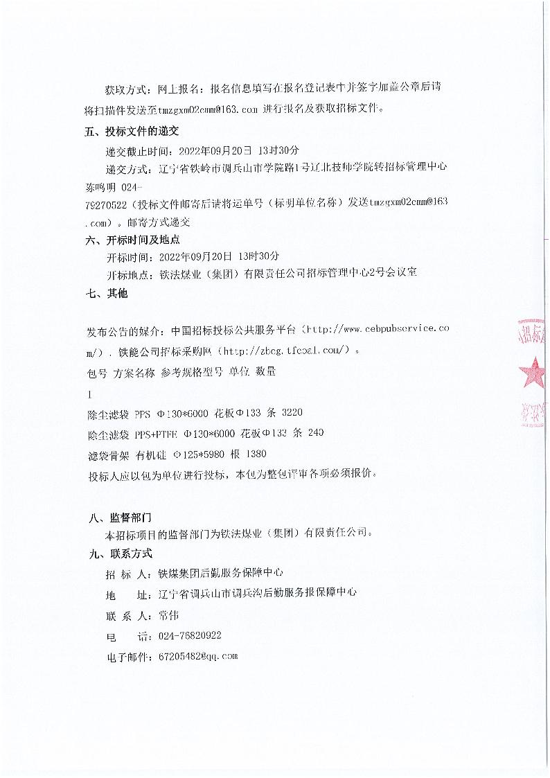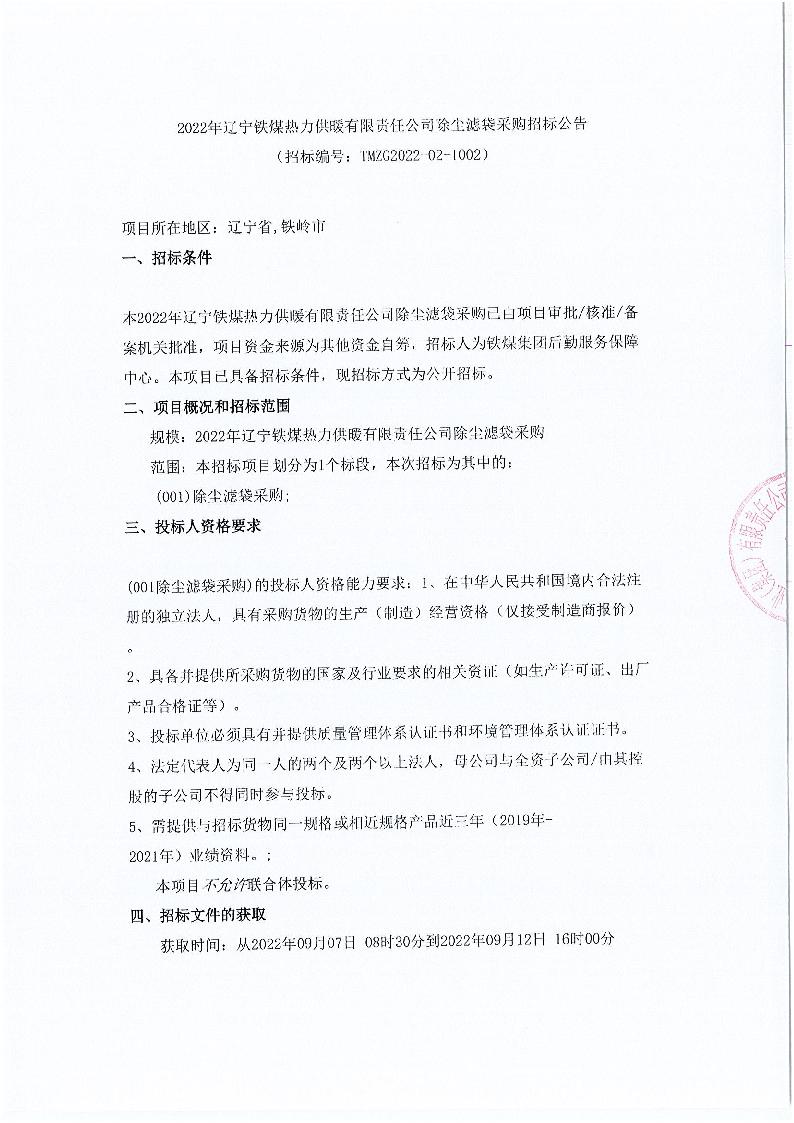 2022年辽宁铁煤热力供暖有限责任公司除尘滤袋采购招标公告