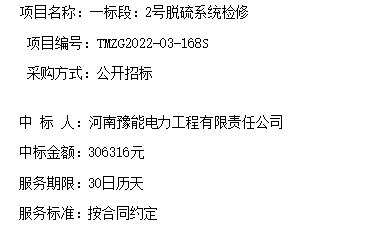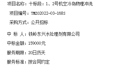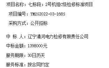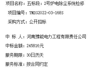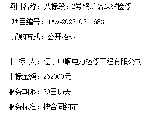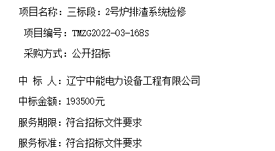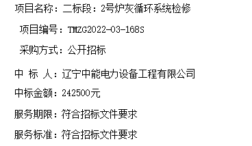 辽宁调兵山煤矸石发电有限责任公司8月份检修项目公开招标中标结果公告