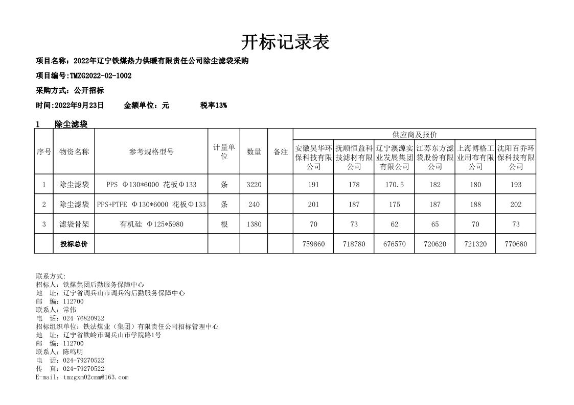 2022年9月23日铁煤热力供暖有限责任公司除尘滤袋采购开标记录标