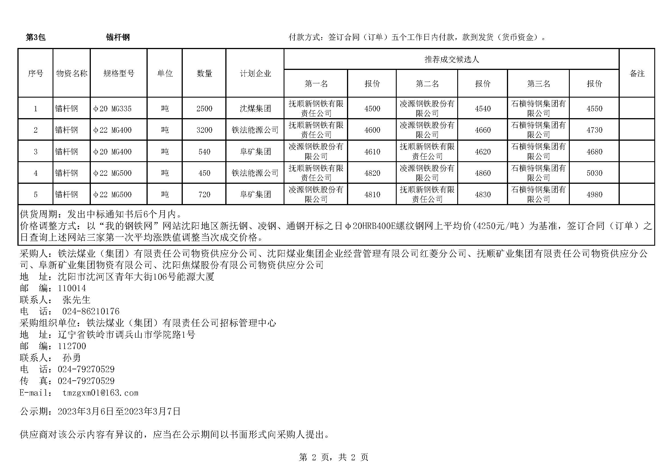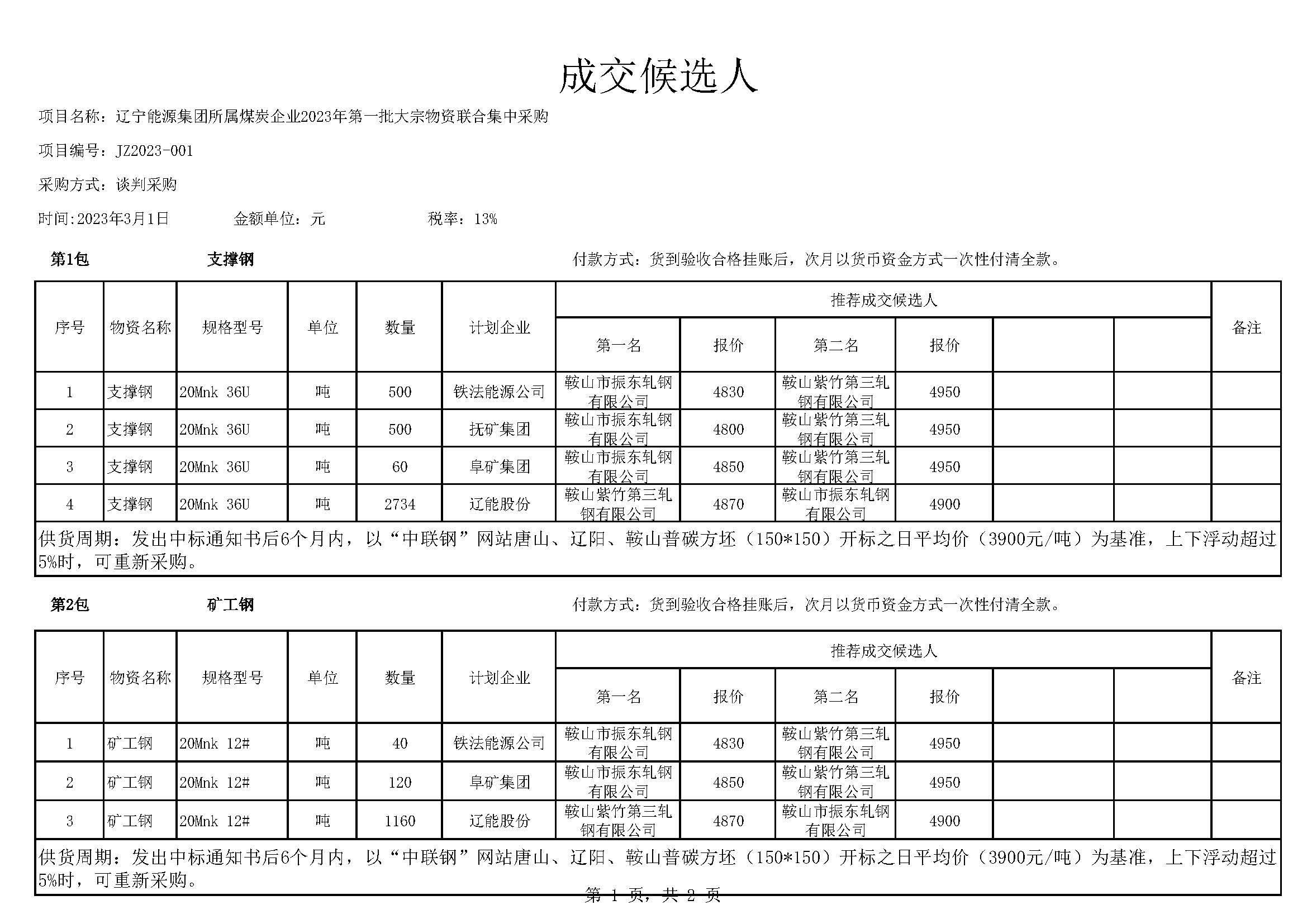 2023年3月1日辽宁能源集团所属煤炭企业2023年第一批大宗物资联合集中采购成交候选人公示