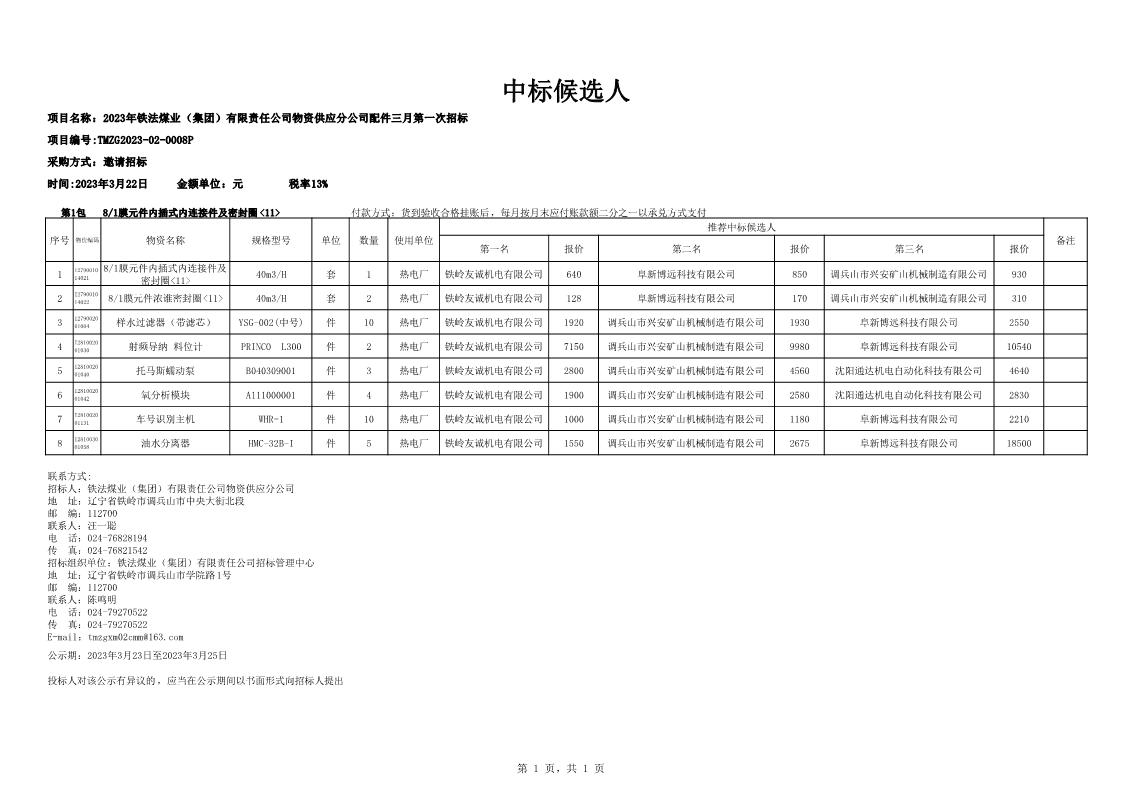 2023年3月22日配件邀请招标中标候选人公示