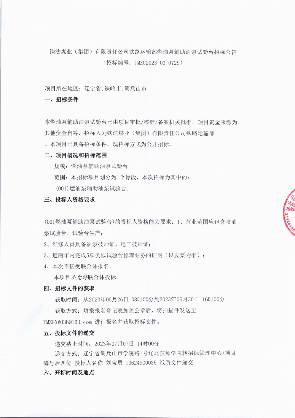 铁法煤业(集团)有限责任公司铁路运输部燃油泵辅助油泵试验台招标公告