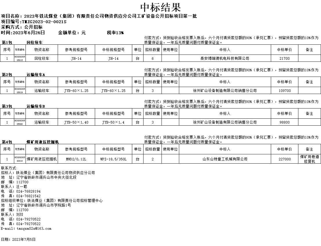 2023年6月26日工矿设备公开招标中标结果公告