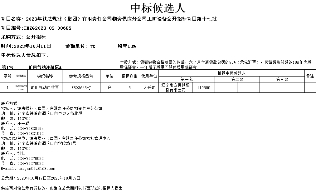 2023年10月11日工矿设备中标候选人公示(0068S)