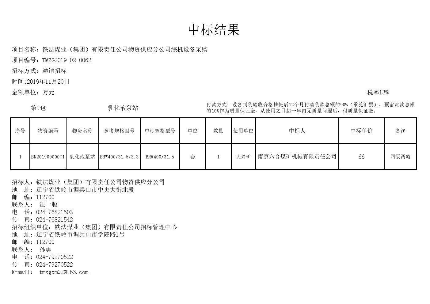 2019年11月20日综机设备中标结果公示