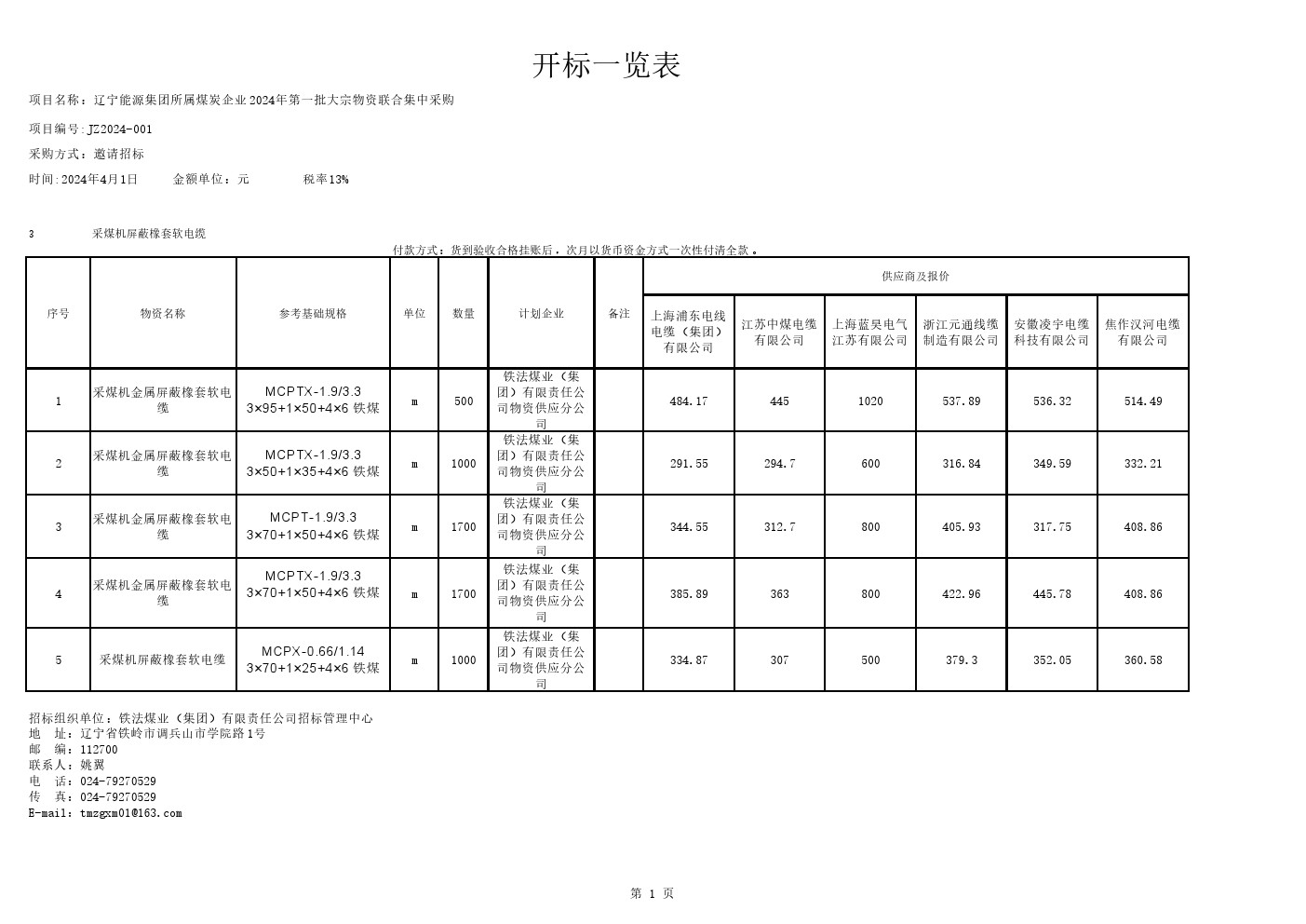 辽宁能源集团所属煤炭企业2024年第一批大宗物资联合集中采购开标一览表(邀请招标)