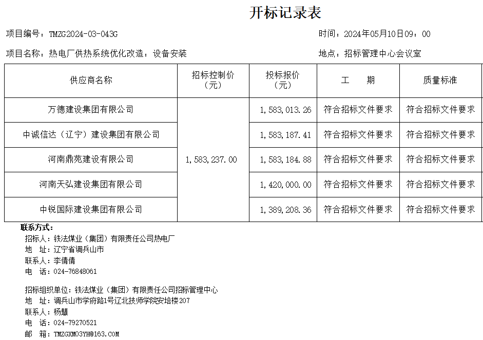 铁法煤业(集团)有限责任公司热电厂供热系统优化改造:设备安装开标情况