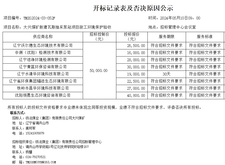 铁法煤业(集团)有限责任公司大兴煤矿新建瓦斯抽采泵站项目竣工环境保护验收开标情况及否决原因公示