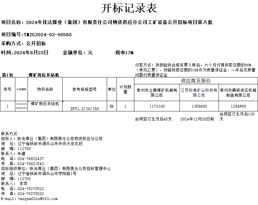 2024年8月23日工矿设备公开招标项目第八批开标记录表