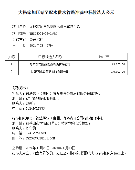 铁法煤业(集团)有限责任公司后勤服务保障中心大杨家加压站至配水供水管路冲洗中标候选人公示
