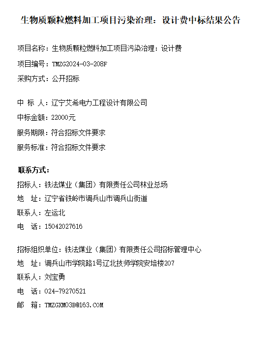 铁法煤业(集团)有限责任公司林业总场生物质颗粒燃料加工项目污染治理:设计费中标结果公告