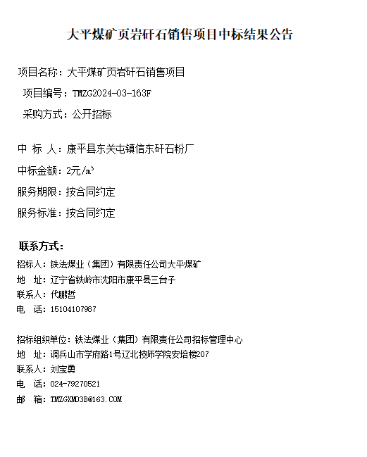 铁法煤业(集团)有限责任公司大平煤矿大平煤矿页岩矸石销售项目中标结果公告