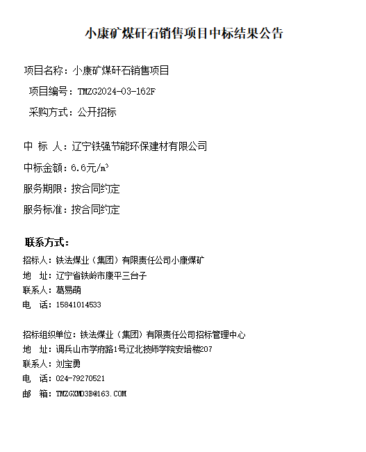 铁法煤业(集团)有限责任公司小康煤矿小康矿煤矸石销售项目(二次)中标结果公告