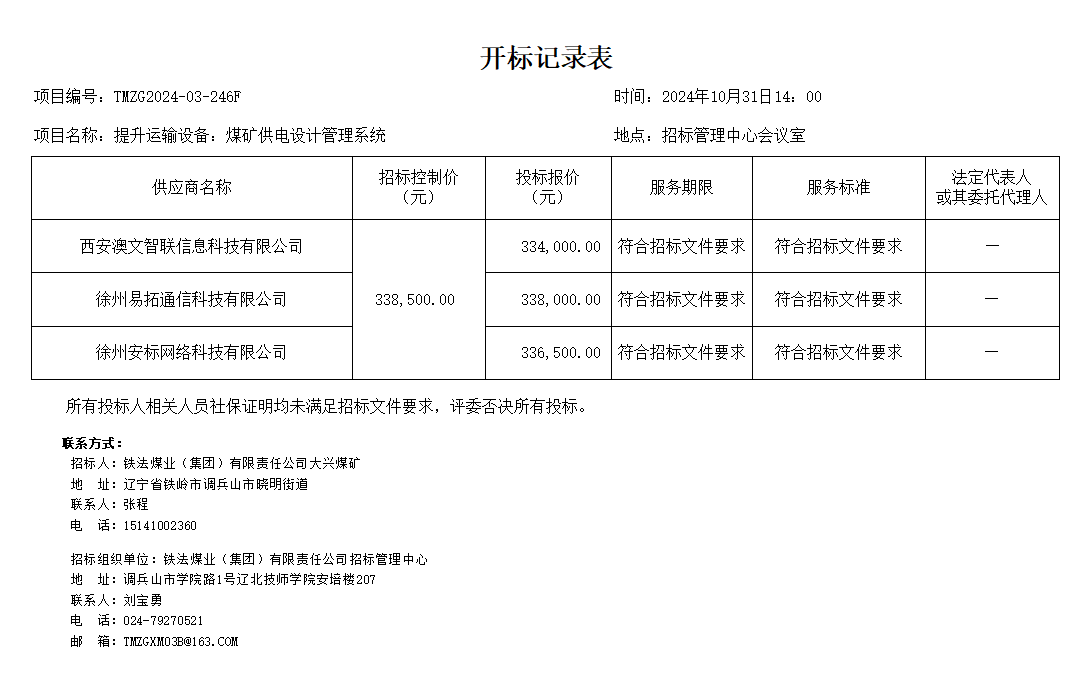 铁法煤业(集团)有限责任公司大兴煤矿提升运输设备:煤矿供电设计管理系统开标情况及否决