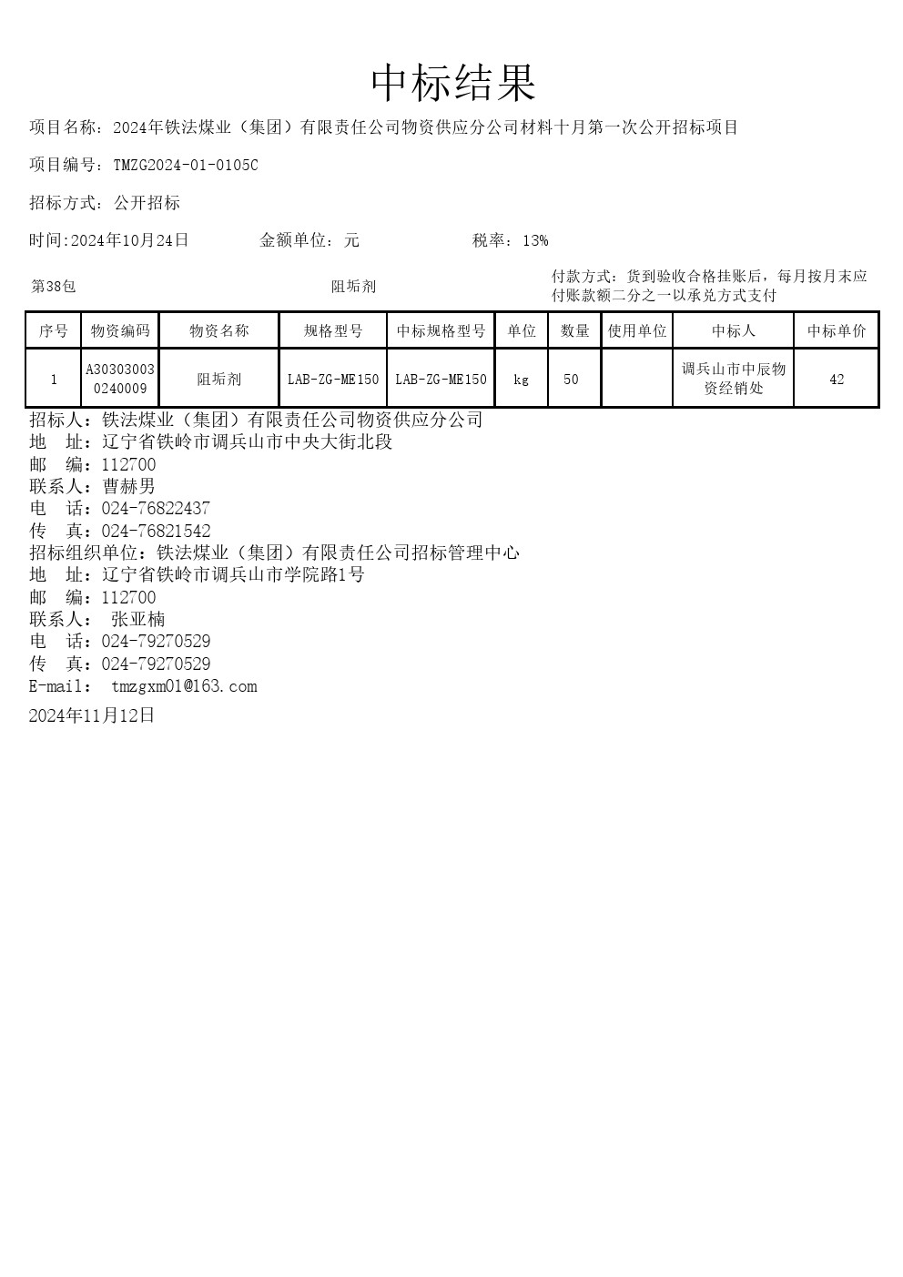 2024年10月24日材料公开招标第38包中标结果公示(0105C)