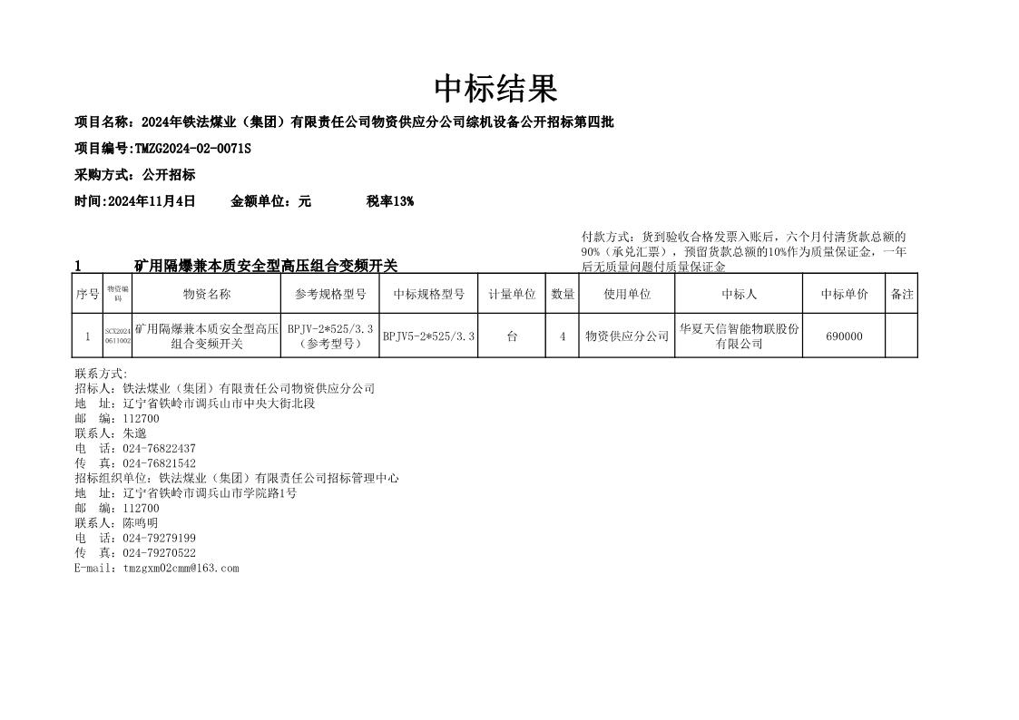 2024年11月4日综机设备中标结果公告(0071S)