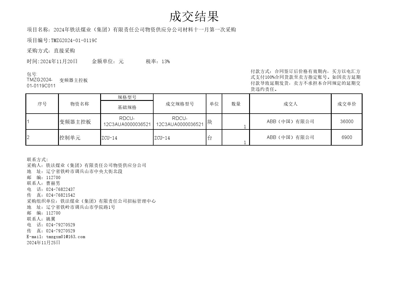 2024年11月20日材料成交结果公告(0119C)2