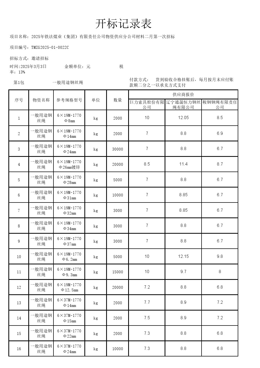 2025年3月3日材料邀请招标报价一览表(0022C)